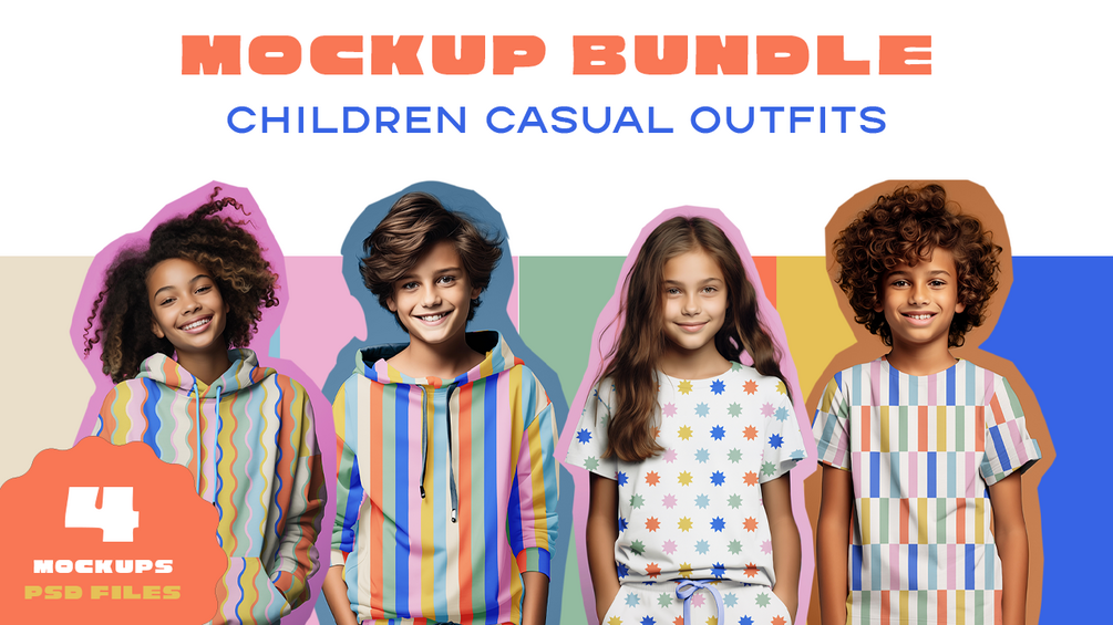 Hi! This is a photorealistic mockup bundle contains 4 files of children wearing casual outfits. In all the Mockups you can edit the background color and the clothes style, I put 2 option of editing for the clothing: